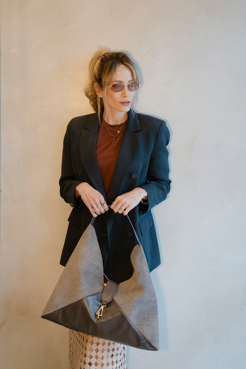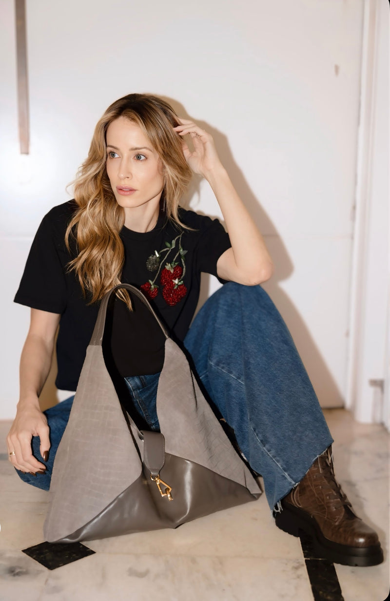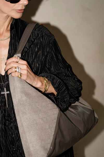 A Bolsa Carolina é uma bolsa de ombro de formato trapezoidal fluido, feita à mão, com caimento elegante e presença naturalmente sofisticada. Seu design amplo valoriza movimento e se adapta ao corpo com leveza, unindo estilo e conforto.