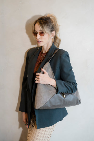 Bolsa Carolina Couro com Camurça Croco Cinza Elefant