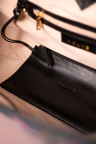 No interior, acompanha uma bolsinha de couro destacável presa ao forro, ideal para organizar itens essenciais com segurança, um detalhe funcional e elegante.