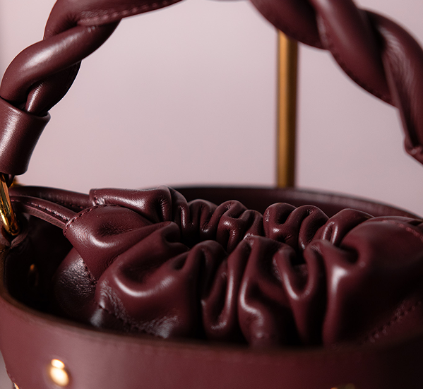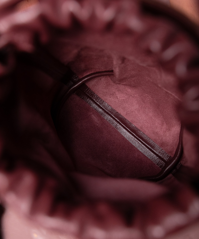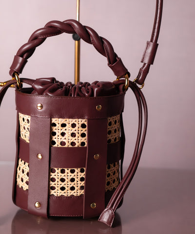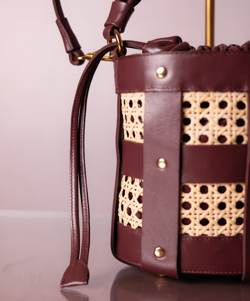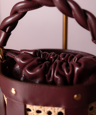 O modelo conta com alça de mão trançada em couro, fixada por ferragens metálicas arredondadas, e alça tiracolo em nó decorativo. O fechamento é feito por bolsinha interna tipo saco em couro, com cordão e acabamento embutido, garantindo segurança e charme adicional.