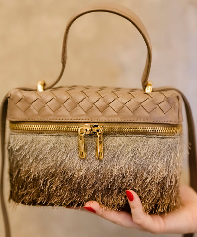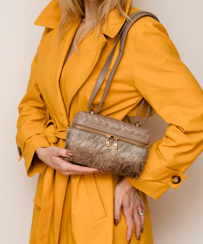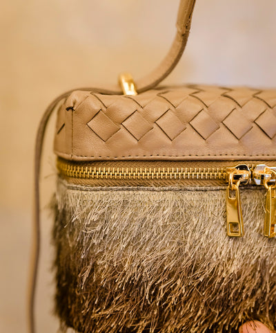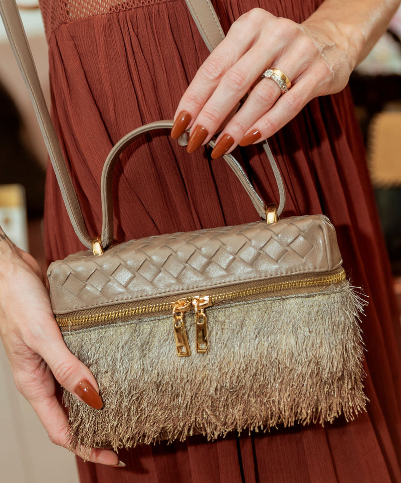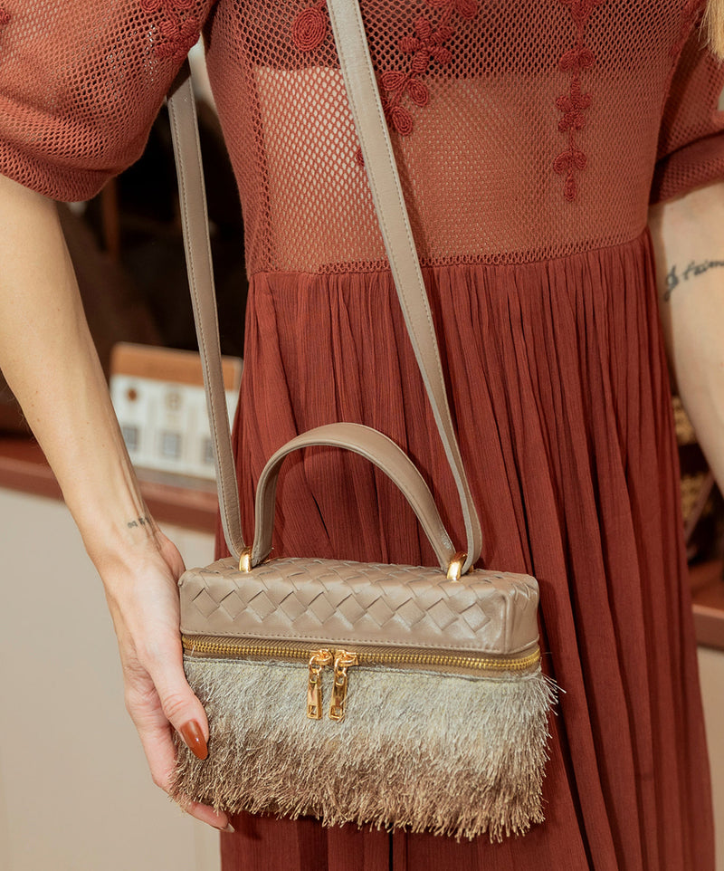 Bolsa Luana Couro Cinza grafite em Tressê com tecido de Efeito Peluciado