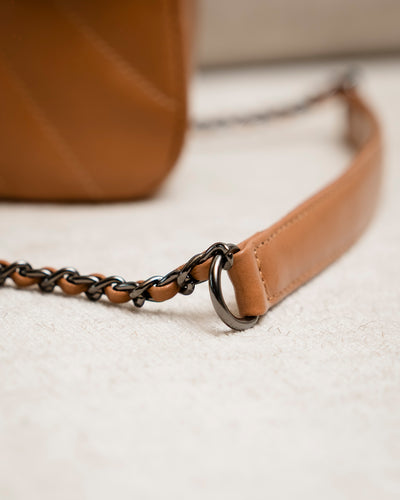 A alça de corrente acrescenta um toque moderno e urbano, permitindo diferentes formas de uso — no modo transversal ou apoiada no ombro.