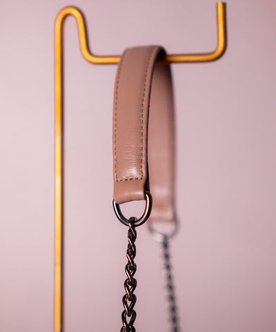 A alça de corrente acrescenta um toque moderno e urbano, permitindo diferentes formas de uso — no modo transversal ou apoiada no ombro.