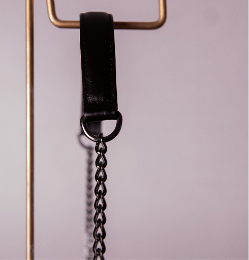 A alça de corrente acrescenta um toque moderno e urbano, permitindo diferentes formas de uso — no modo transversal ou apoiada no ombro.