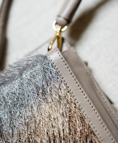Bolsa Maria Lúcia -Couro Cinza Grafite com Tecido de Efeito Peluciado