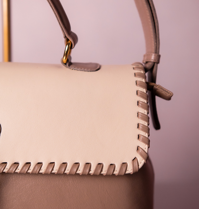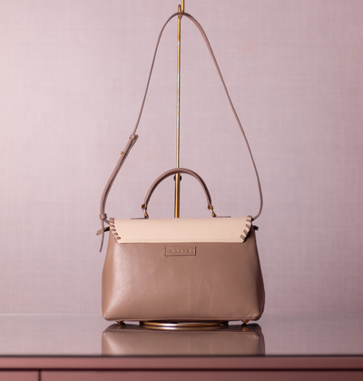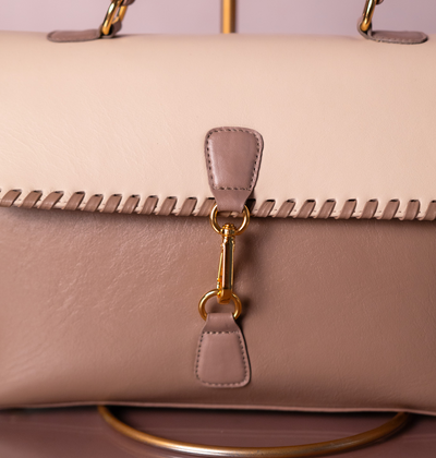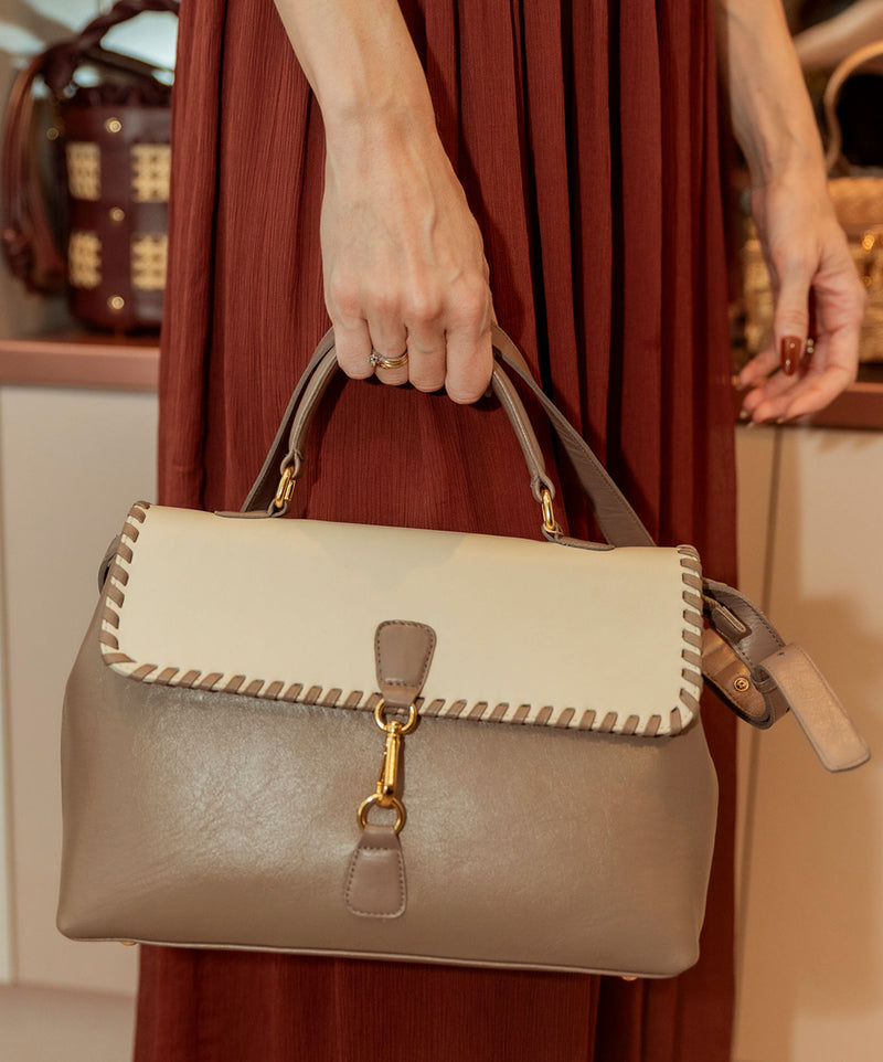 A Bolsa Renata é um modelo estruturado que combina textura, presença e elegância. Seu design traz a fusão entre couro e materiais de superfície especial, criando um contraste visual sofisticado e marcante. A tampa superior recebe acabamento com pesponto artesanal aparente, reforçando o caráter único do modelo.
